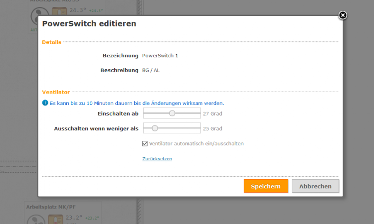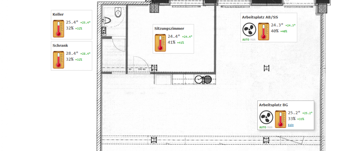Ist an dem jeweiligen Sensor-Standort ein Standventilator angeschlossen (im Sommer), erscheint auch ein Lüfter Symbol (wenn der Ventilator eingeschaltet ist mit Rotations-Animation): Die Mitarbeiter, die an einem Arbeitsplatz mit Ventilator sitzen, können (berechtigungsgesteuert) ihn direkt im Browser ein- oder ausschalten (die Ventilatoren stehen oft an "schwer zugänglichen Stellen") und die Temperaturschwellenwerte regeln. Die Schaltung erfolgt per HTTP-Aufruf an die myStrom PowerSwitchs die in einem eigenen, vom Büro Netzwerk isolierten WLAN mittels Static DHCP eingebunden sind.