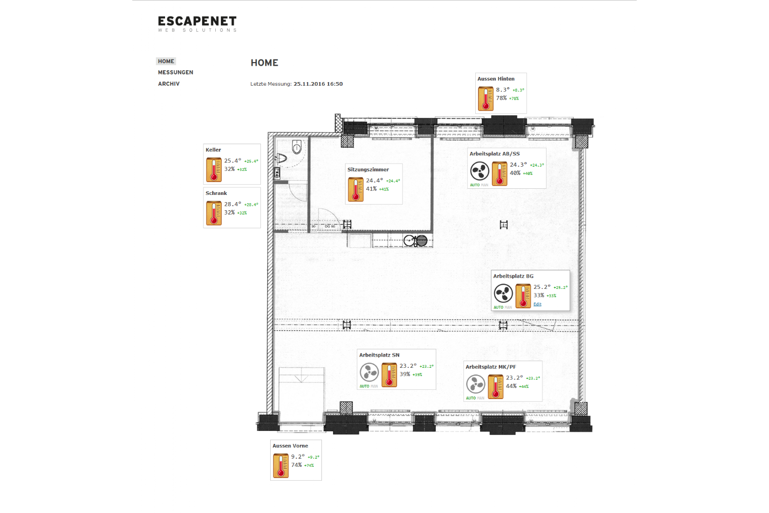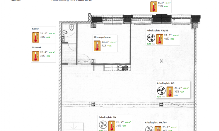 Eine kleine Webseite mit einem Büroplan im Massstab 1:100 präsentiert die neuesten Werte für jeden Sensor: Neben der aktuellen Temperatur und Luftfeuchtigkeit, wird auch die Veränderung zum vorhergehenden Wert dargestellt.