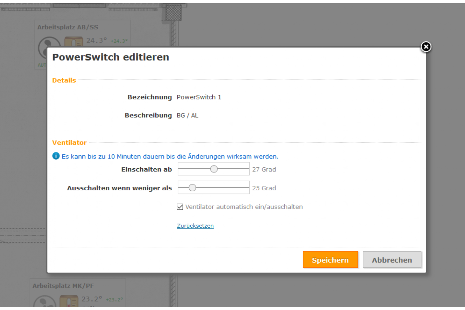 Die Ventilatoren schalten sich auch selbst ein oder aus (sofern die Option von den Mitarbeitern aktiviert ist): Werden die jeweils definierten Schwellenwerte über- bzw unterschritten, werden im selben Batch, der die neuesten Messwerte in die SQL Datenbank speichert, auch die HTTP-Befehle für die Schaltung abgesetzt.