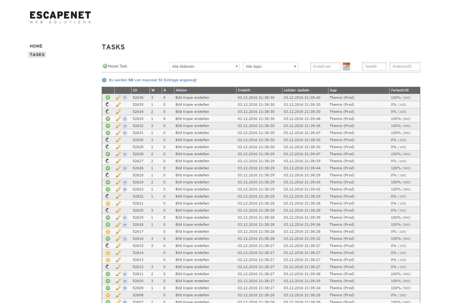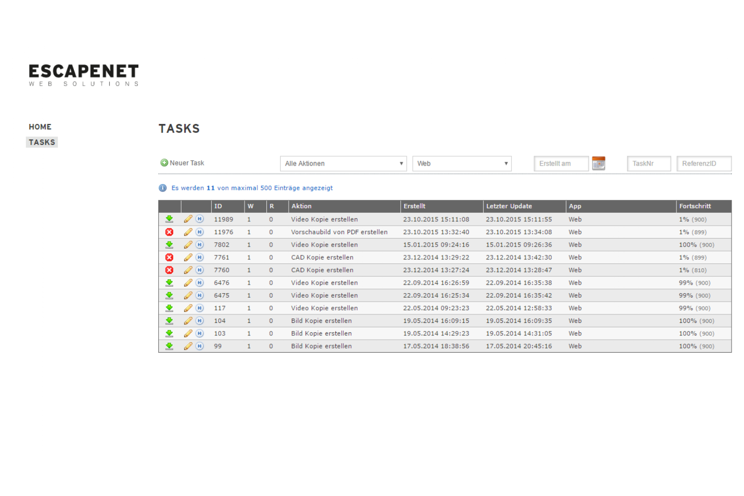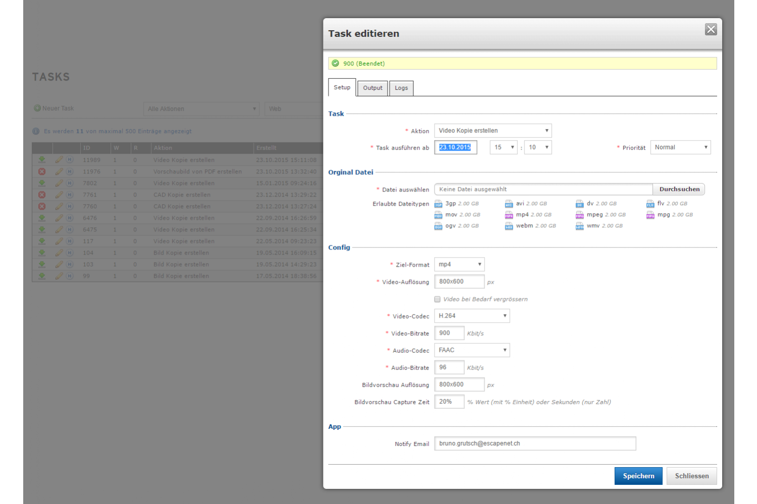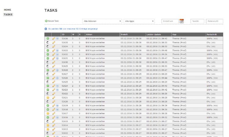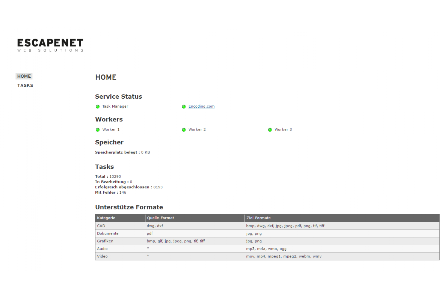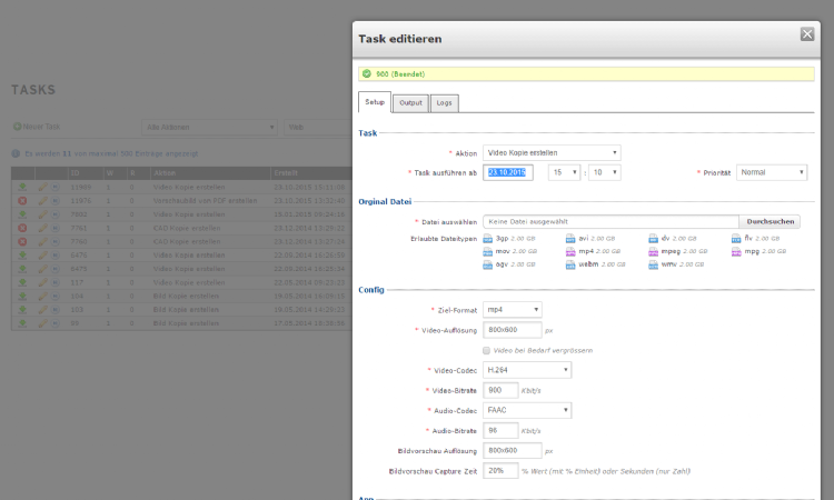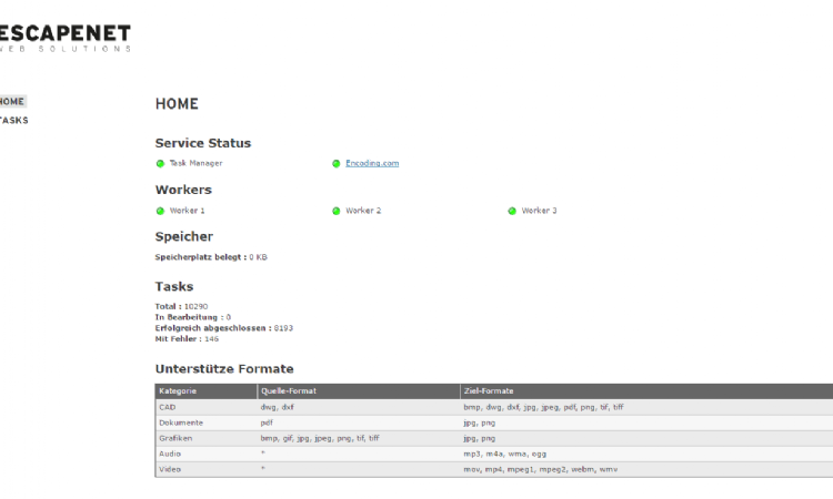Über eine Weboberfläche lässt sich jederzeit ein Blick auf die aktuellen und vergangenen Tasks werfen. Auch lassen sich manuell Tasks erstellen falls man z.B. ein einzelnes Video konvertieren muss.
