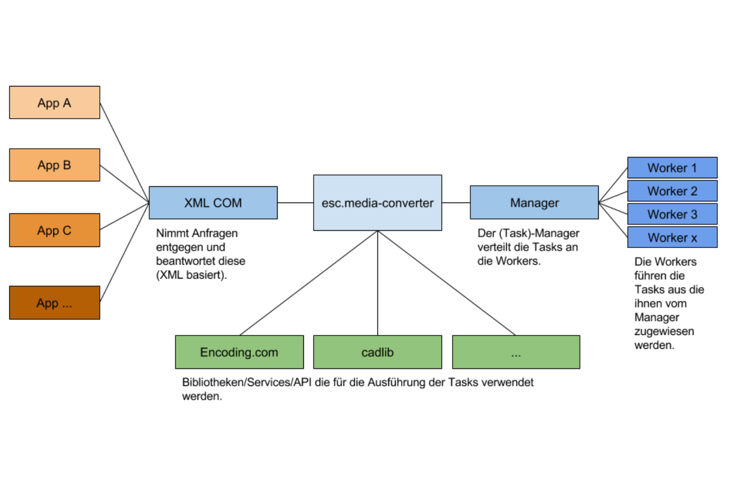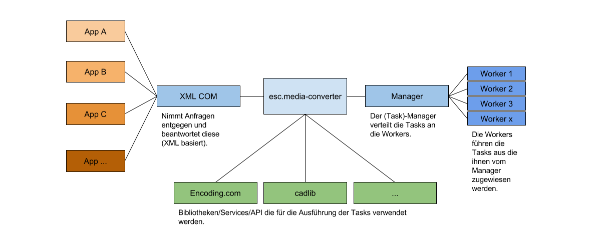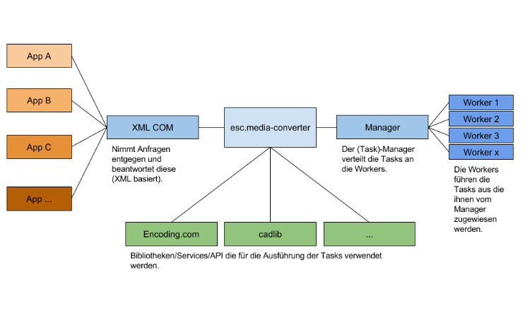 Im Hinblick darauf dass zukünftig wohl auch andere Kunden Videos im Web veröffentlichen wollen, wurde, anstatt die Encoding.com API direkt ins Themis zu integrieren, ein Escapenet eigener Service erstellt. Dieser soll Web Applikationen von Escapenet und deren Kunden eine einfache Möglichkeit bieten, Medien verarbeiten bzw konvertieren zu lassen, ohne dass jedesmal eine zeitaufwendige Implementation von Drittanbieter-APIs nötig ist. Einfachheitshalber wurde die Kommunikation / API hier ebenfalls XML basiert umgesetzt.