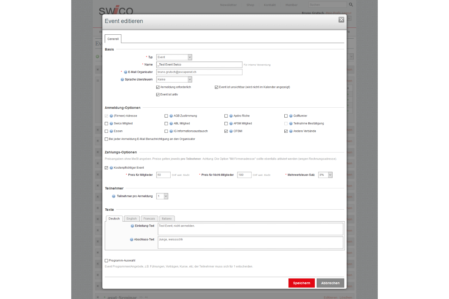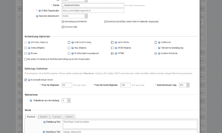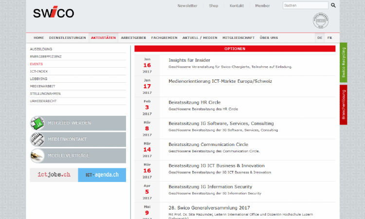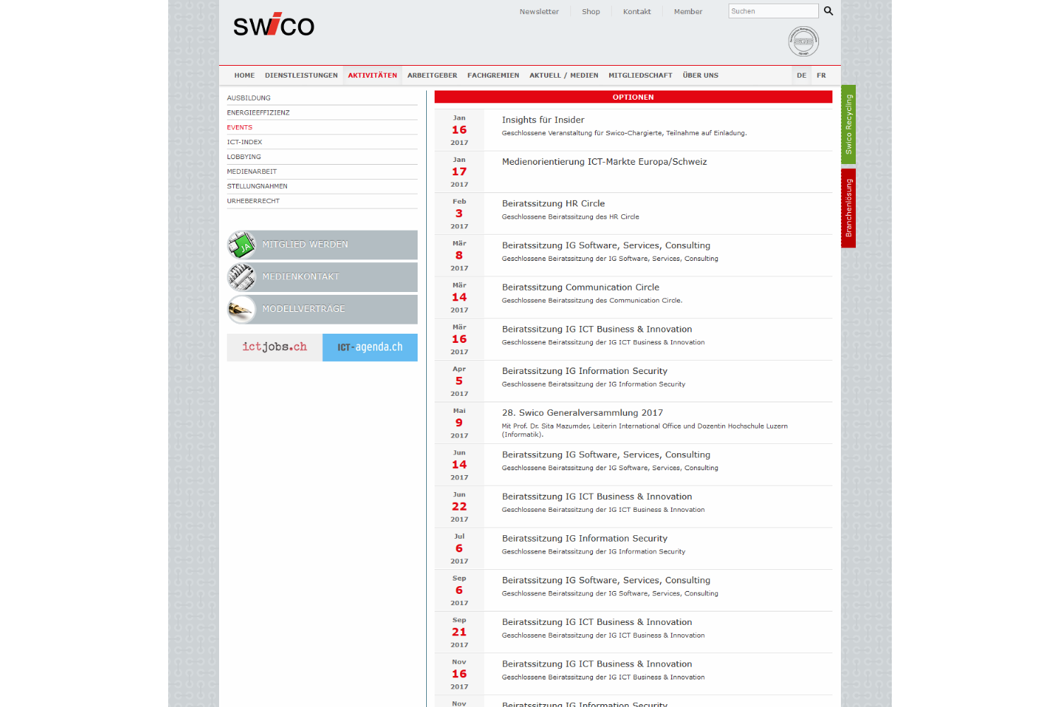 Eine weitere Anforderung war, das von uns entwickelte und bisher eingesetzte Events-Modul weiterzuführen, da dieses sehr Swico spezifische Optionen beinhaltete. Diese Events werden in einem eigenen, Swico spezifischen CMS verwaltet.