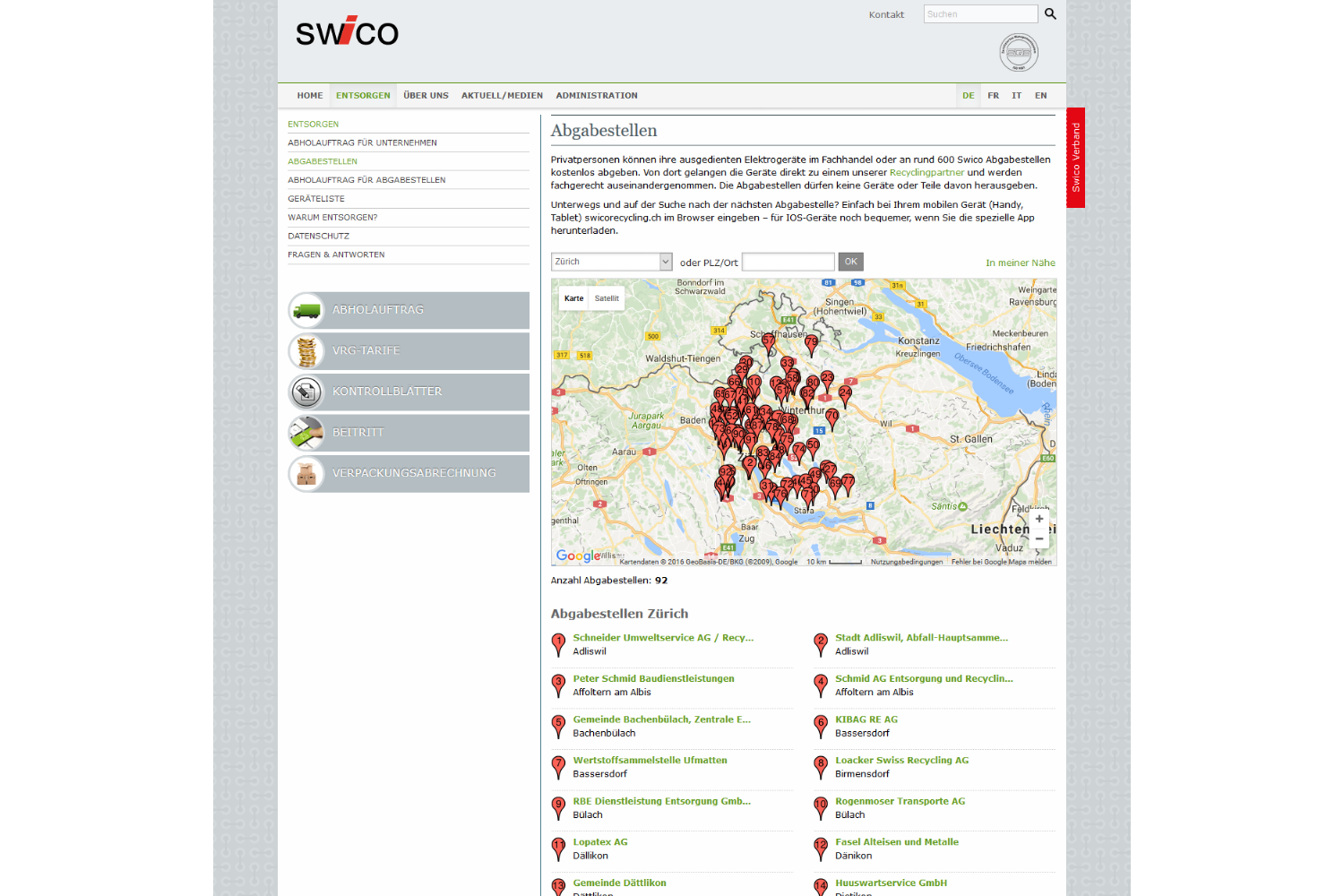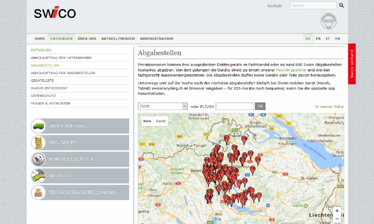 Bei Swico Recycling wurden die vielen Abgabestellen besser visualisiert: Zum einen durch eine Darstellung auf einer Google Map, zum anderen mittels Auflistung inkl. der Distanz ab dem Standort des Clients (sofern bekannt). Ausserdem wurde eine XML Schnittstelle implementiert um die VRG (Vorgezogene Recycling-Gebühr) Tarife zu importieren, welche nur in einer externen Datenquelle vorliegen.