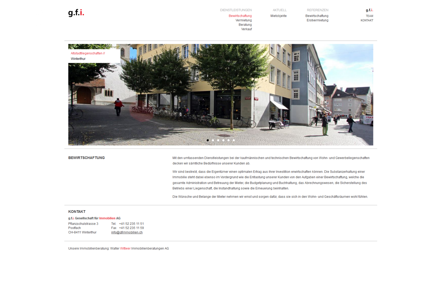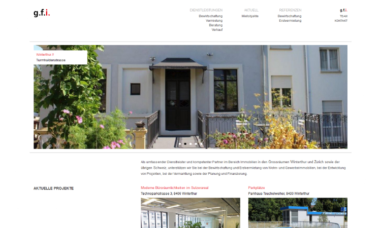 Als Besonderheit wurde eine Schnittstelle für die Immobilien Angebote zwischen den Webseiten realisiert: Auf der w.w. Webseite werden für gewisse Bereiche Angebote von der g.f.i. angezeigt und umgekehrt.