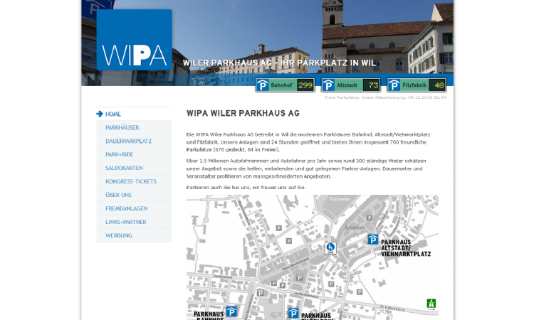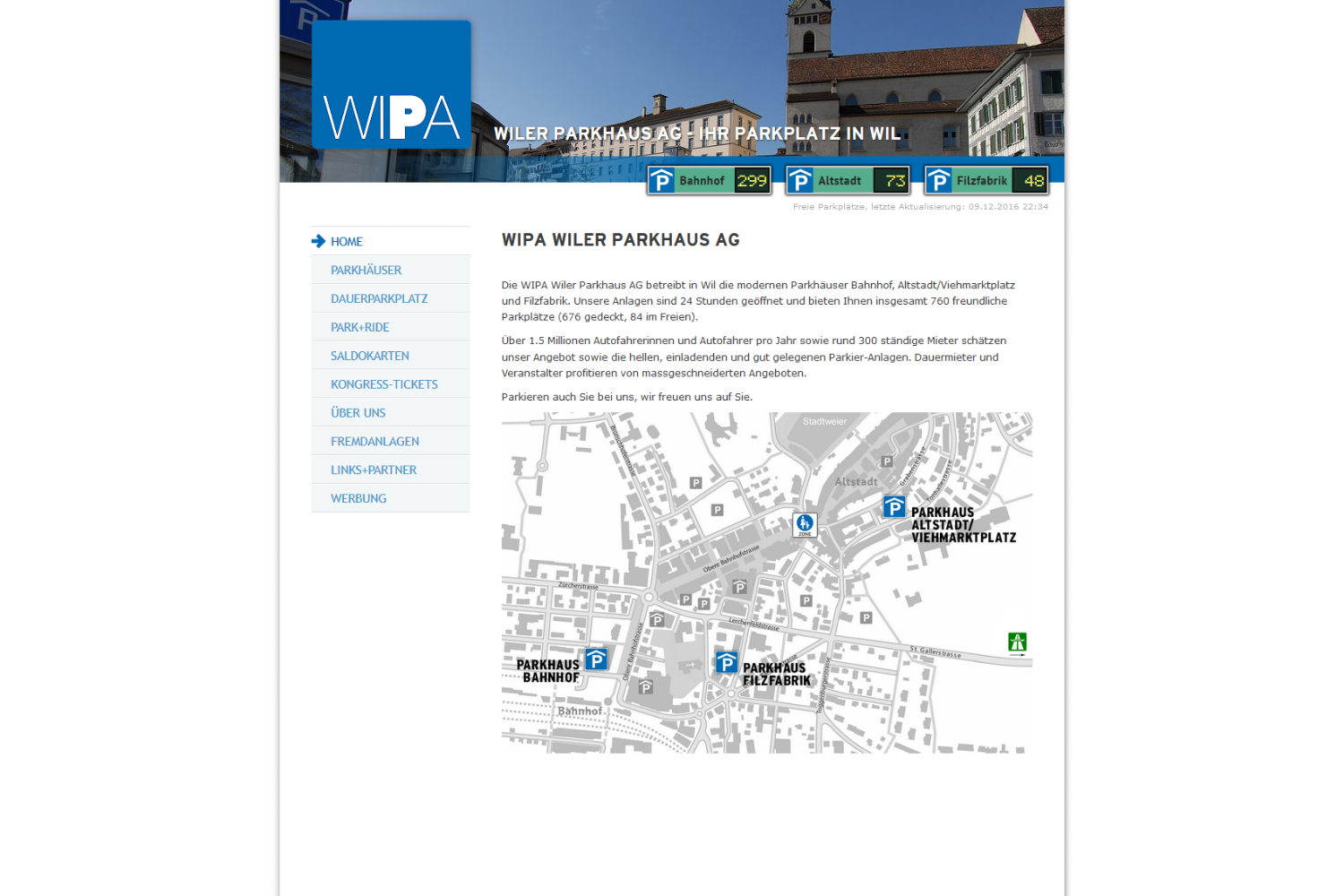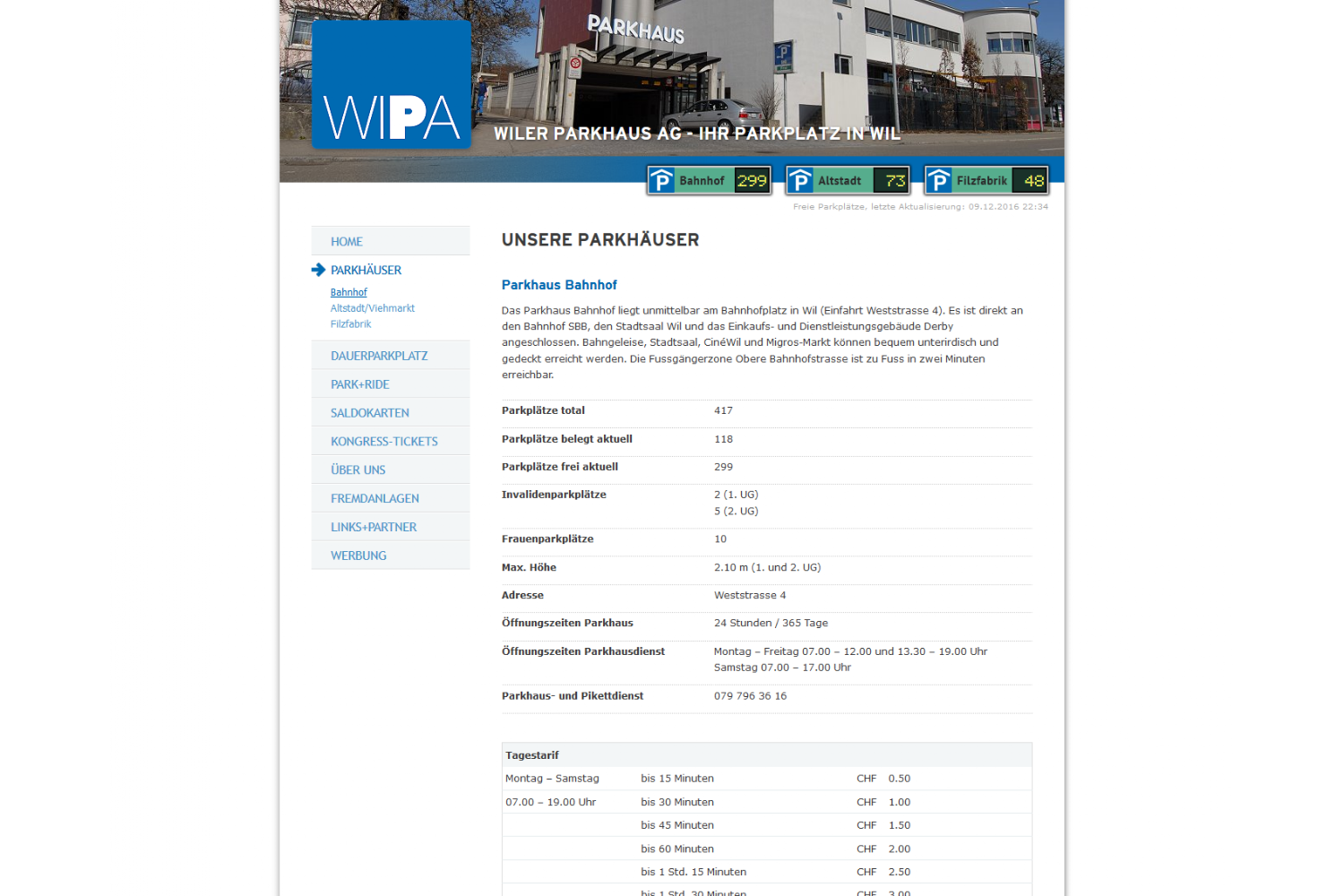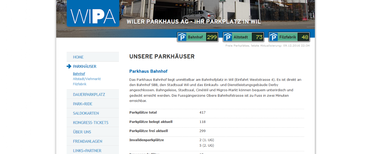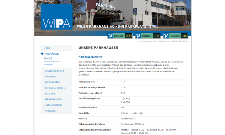 Webseite für mehrere Parkhäuser in Wil SG mit Infos zu den aktuellen freien Plätze und diverse Bestellformularen.