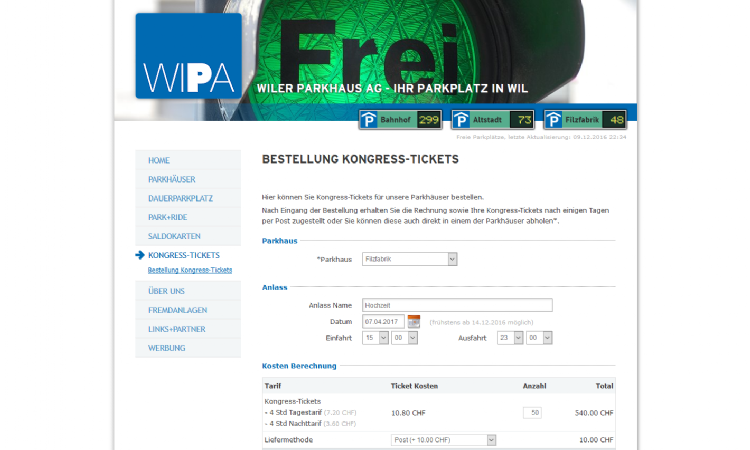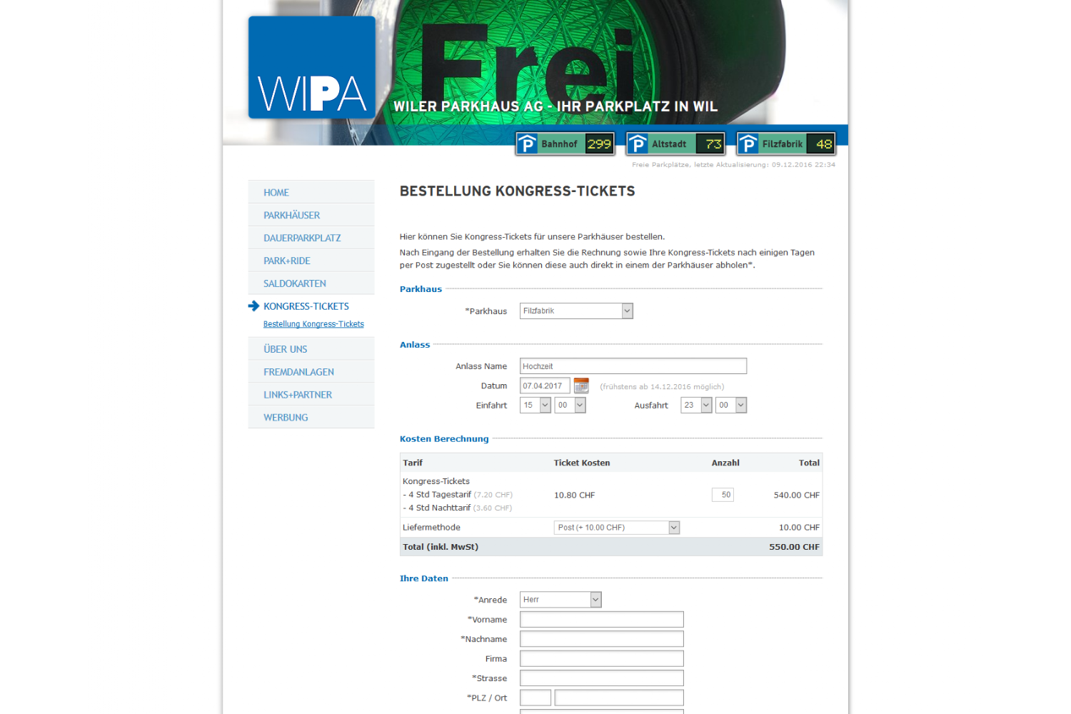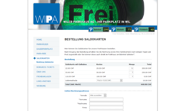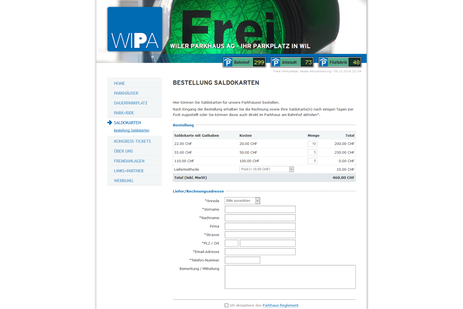 Neben informativen Seiten zu den Parkhäusern wurden auch diverse Bestellformulare umgesetzt: Der Besucher kann Mietverträge, Saldokarten und Parktickets für Anlässe direkt online bestellen.