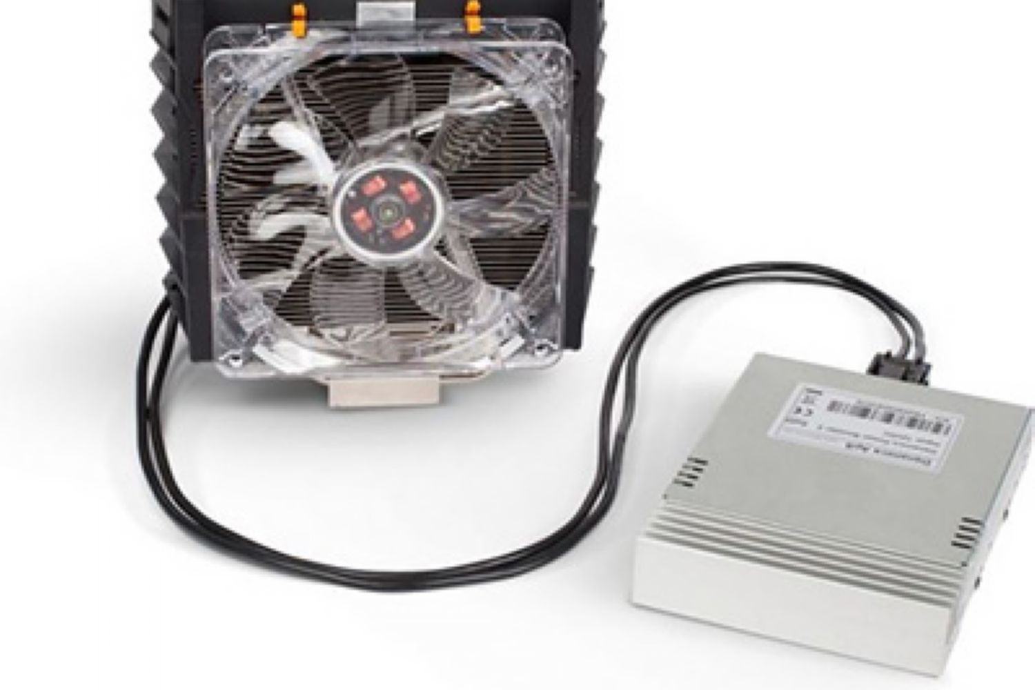 Auf den ersten Blick sieht der Danamics aus wie jeder andere Turmkühler. Erst auf den 2. Blick entdeckt man das zweiadrige Kabel das vom Kühler zu einem kleinen Kästchen, der sogenannte Power Booster 2, verläuft. Dieser baut man in ein 3.5 Zoll Schacht im Gehäuse ein und verbindet ihn mit dem Netzteil. Das Kästchen ist dafür zuständig die elektrisch-magnetische Pumpe im Kühler anzutreiben damit das flüssige Metall zirkulieren kann. Diese arbeitet dabei lautlos.